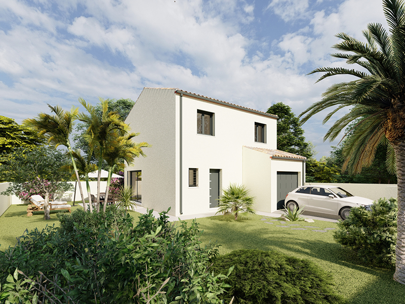Alliant simplicité et modernité, MAISON LACIN présente son modèle PERSEE : Maison T4 avec toit terrasse d’une surface de 90 m² avec garage accessible par le cellier.